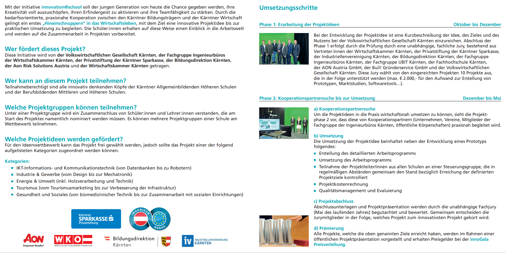 Mit der Initiative innovation@school soll der jungen Generation von heute die Chance gegeben werden, ihre Kreativität voll auszuschöpfen, ihren Erfindergeist zu aktivieren und ihre Teamfähigkeit zu stärken. Durch die bedarfsorientierte, praxisnahe Kooperation zwischen den Kärntner Bildungsträgern und der Kärntner Wirtschaft gelingt ein ersten "Hineinschnuppern" in das Wirtschaftsleben, mit dem Ziel eine innovative Projektidee bis zur praktischen Umsetzung zu begleiten. Die Schüler:innen erhalten auf diese Weise einen Einblick in die Arbeitswelt und werden auf die Zusammenarbeit in Projekten vorbereitet.
